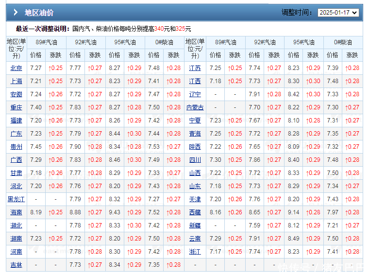 油价“180°大拐弯”!按照汽柴油10个工作日调价一次的规定,最近一次汽柴油调价出现在2025年1月16日24时,此次为今年第2次调价,上次油价于1月2日上涨70元/吨,本次油价受原油市场走高,汽柴油统计上涨340元以及325元/吨,单次92,95号汽油涨幅在0.27~0.3元。目前,各地加油站92,95号汽油以及0号柴油更新完毕,从市场反馈分析,主流92号汽油报价在7.7~7.9元左右,95号汽油普遍在8.2~8.4元/升左右……